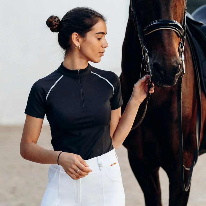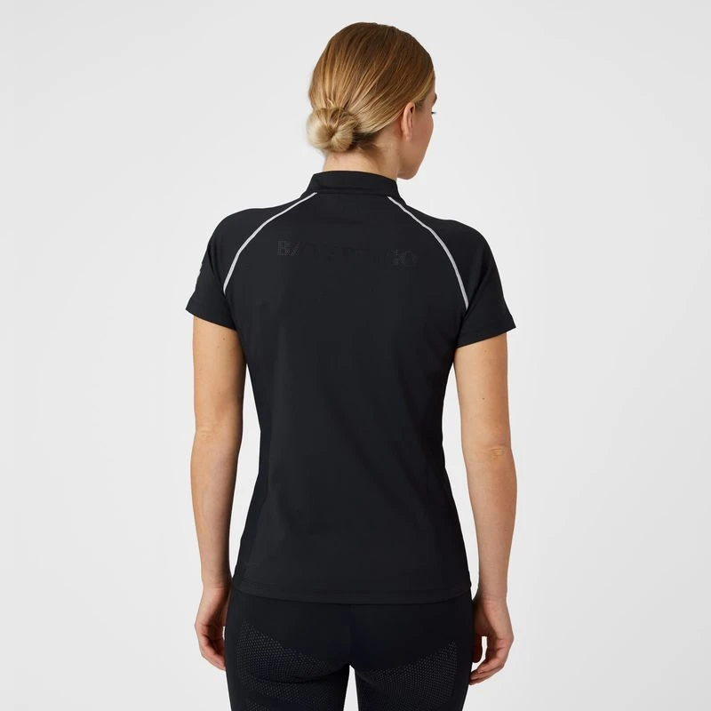 The breathable B Vertigo Adara training shirt is made from quick-drying material. Ribbed sides provide the perfect fit. However you need it, the front zipper can add ventilation or warmth. Raglan sleeves and the lazer cut back logo look sporty and cool. Combine this shirt with our B Vertigo Adara riding tights for a full outfit.