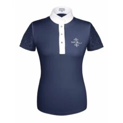 This short sleeve competition shirt is made of stretchy, breathable, and moisture wicking technical fabric. The sleeves and back inserts are mesh for increased airflow. The tab collar and placket are secured with decorative buttons and the back features a tone on tone design.