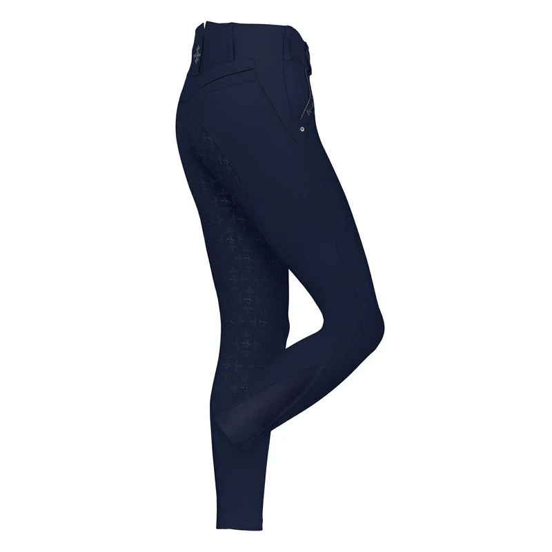 This classic high waist, full seat breech is made in a four stretch fabric. It has a comfistick silicon full seat and elastic leg bottoms. The two slanted side pockets are decorated with discreet floral crystals. The tailored waistband has a vee back and belt loops.