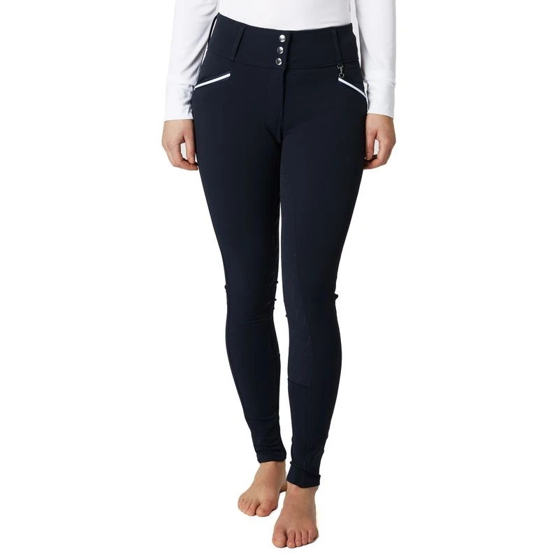 Horze Della Breeches are equipped with a high waist and designed in classic shape and colors. Contrast piping looks flattering, and the silicone full seat provides great grip to the saddle