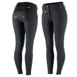 The Horze Grand Prix Thermo Softshell Full Seat Breeches will be your favorite cold weather riding breech. These new and improved Grand Prix-style riding pants are water repellent and designed with a full silicone seat for great grip in the saddle. These fleece-lined wide waist breeches provide that extra layer of warmth you need on the coldest days. Breathable soft-shell fabric repels hay and horse hair so you will always look neat and tidy. The full seat allows freedom of movement with elastic leg bottoms that provide a smooth fit under tight boots or chaps. The Grand Prix Thermo Softshell Breeches feature a comfortable wide waistband, front zipper, and two front pockets.