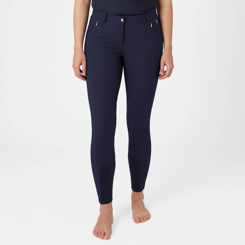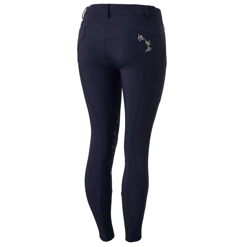 The Horze Kaitlin Breeches are made from soft, stretchy 88% polyester and 12% elastane material. Front pockets with zippers keep your phone safe. The back pockets are embroidered with silver leaves matching the floral silicone knee patches. Muted colors fit your riding wardrobe perfectly.