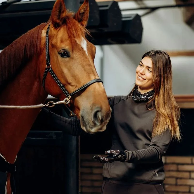 Features include breathable technical fabric with two zipper pockets to keep your hands warm and your belongings safe. The flower pattern on the collar adds lovely detail. Combine this tech top with the Horze Kaitlin Breeches for a full outfit.