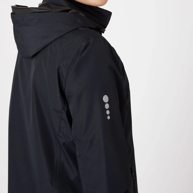 This hip length rain jacket is completely waterproof, with a breathable membrane so you don’t get too hot or sweaty. It is lightweight with no inner lining to weigh you down. All seams are taped, and the interior is bonded. The front zipper is two way, which makes it great for riding.