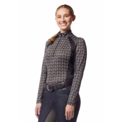 Brushed inside with buttery soft micro-fleece for wicking warmth, this lightweight, breathable performance top features a smooth exterior that sheds hay, horsehair, and dirt and slips easily into sleeves for layering.