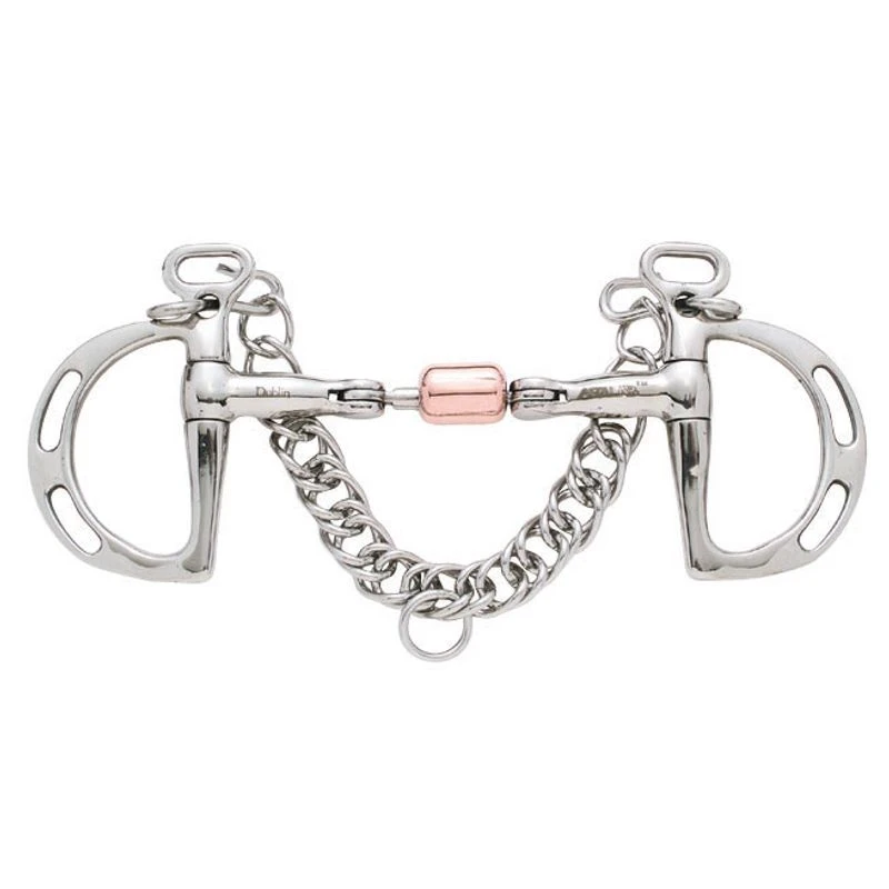 The stainless steel bit is made with a copper roller to encourage bit acceptance and aid in a comfortable, moist mouth. Double-hinged action is helpful to horses with a low pallet and keeps the middle of the bit from hitting the roof of the horse’s mouth. Dual slots on the cheekpiece offer a range of leverage for control through the curb chain. 5-inch.