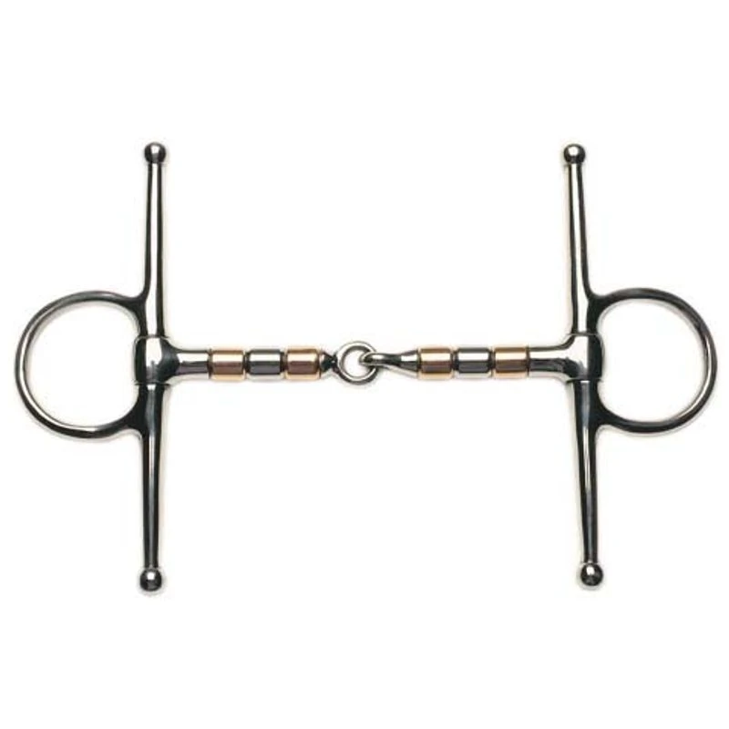 The Korsteel Copper and Steel Roller Full Cheek Snaffle Bit prevents the horse from holding the mouthpiece while the copper increases salivation for a softer mouth.