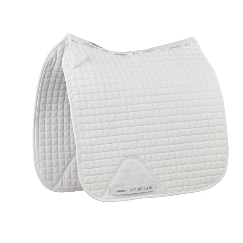 The WeatherBeeta Prime Dressage Saddle Pad is a durable cotton pad with a wick easy lining to help keep your horse cool, dry and comfortable.